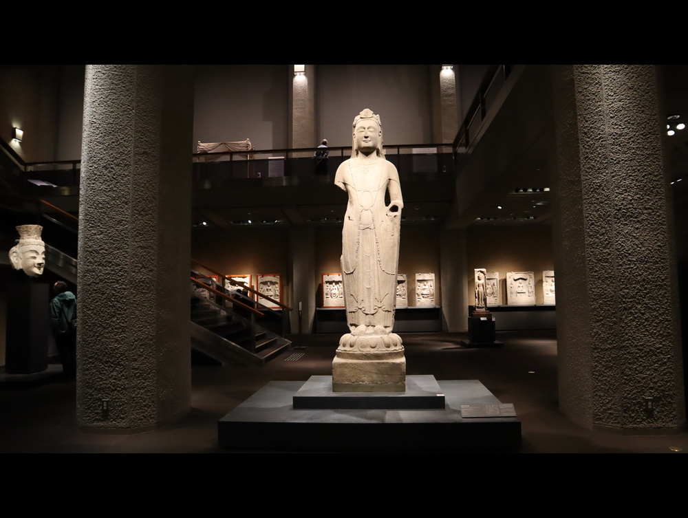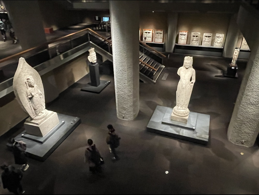 中国南北朝時代から唐時代の仏像を展示する1階を見おろす。抜き抜け空間に屹立する仏像の神々しさに息をのむ。