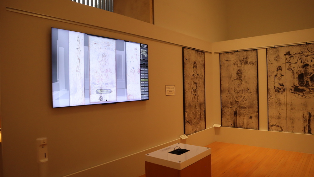 火災で焼損した「法隆寺金堂壁画」や公開が難しい国宝「聖徳太子絵伝」をデジタルコンテンツで体験できるコーナー。大型8Kモニターで絵の詳細までを自在に鑑賞できるほか、臨場感あふれるグラフィックパネル(複製)を展示する。
