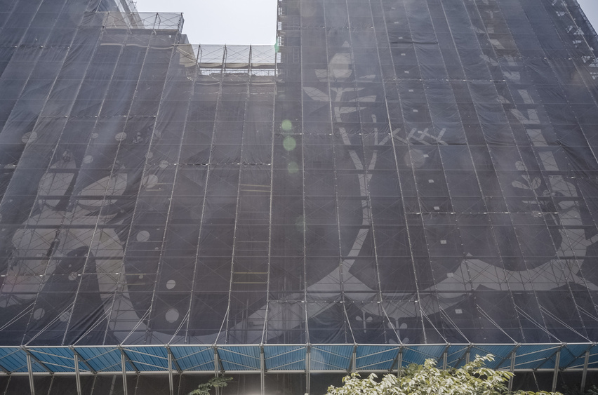 創作中の壁画。壁には足場が組まれ、シートで覆われている。 |