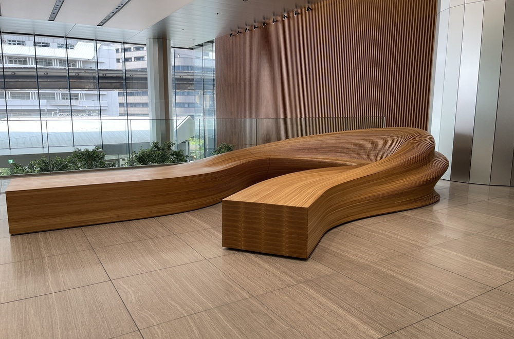 同じく3階、オフィスエントランスに置かれたオブジェは、韓国のアーティストで木工と家具デザインの学士を持つ、べ・セファ作。美しいカーブを描いた、座ることもできる木製のオブジェは、実用性も兼ねたアートです。その独特なフォルムに、思わず目が引き寄せられます。