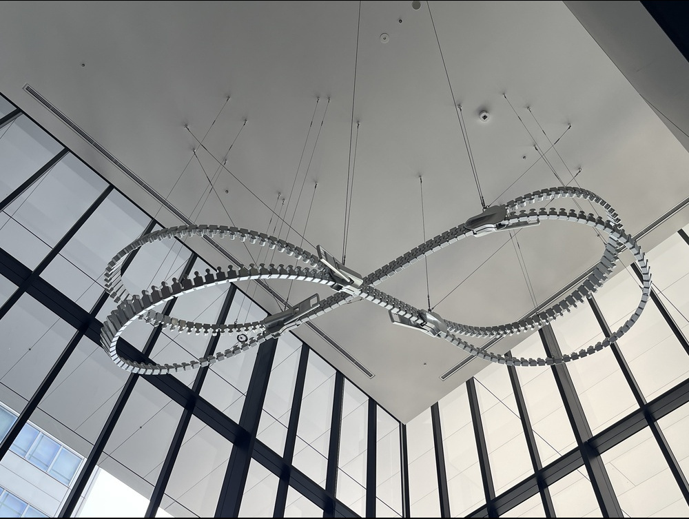 2階のCANAL DINING HALLの天井に吊られている作品。「無限大」の形をした巨大なファスナーは、人の形にも見えるピースで構成されています。よく見ると、それぞれのピースの形は異なっており、まさしく十人十色。ファスナーは開くだけではなく、つなぐものでもあります。そして、この作品からは、人と人、あるいは、人と建物などがつながり、やがて未来にもつながっていくというメッセージを感じることができます。