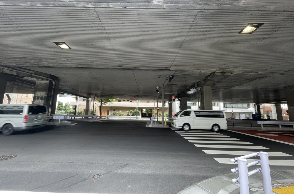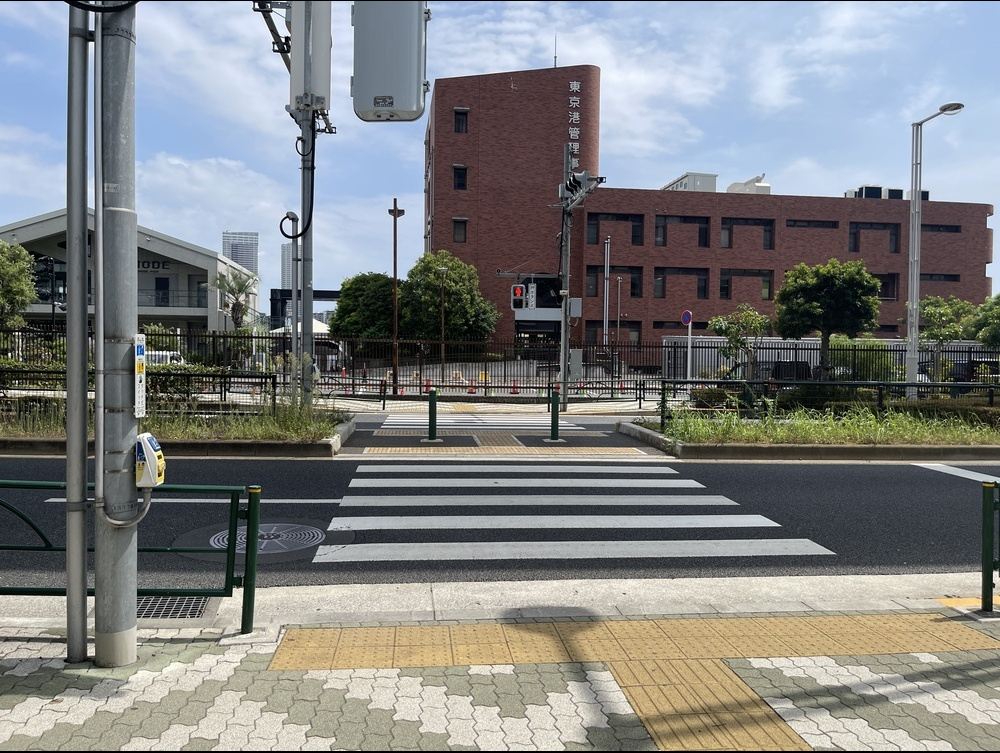 運河にかかる「新芝浦橋」を渡り、首都高速の下をくぐって左へ。そのまま進むと右に「東京港管理事務所」があるので、その前の横断歩道を渡りHi-NODE(ハイ-ノード)へ。