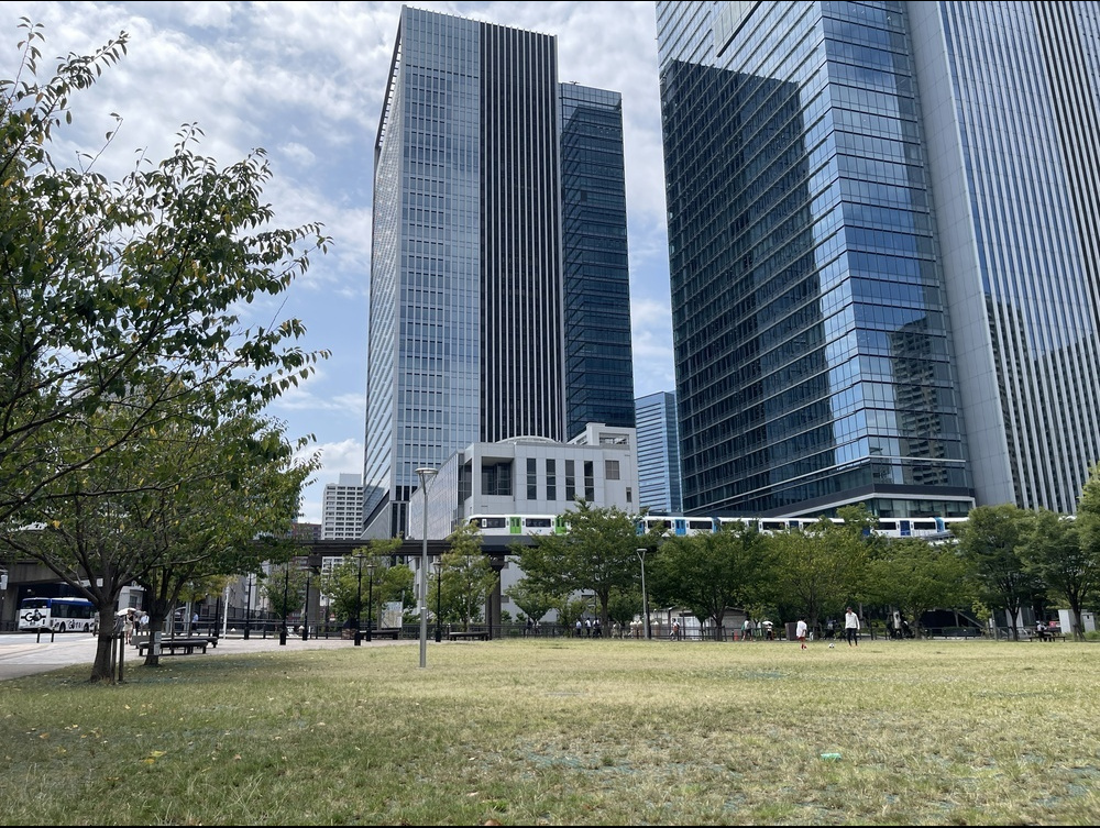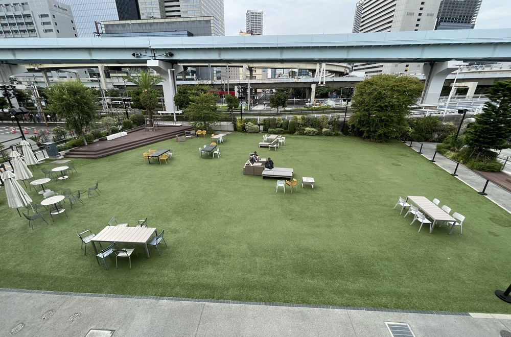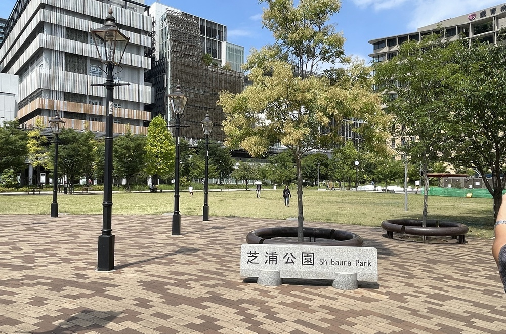 芝浦運河通りに面した「芝浦公園」は、広々とした芝生が魅力の公園です。バスケットコートや子どもが遊べる遊具もあり、地域の憩いの場となっています。芝生からは東京モノレールの線路が見え、モノレールが行き交う風景を楽しむことができます。柵もなく開放的でベンチも多くあり、天気の良い日はのんびりと気持ちよく過ごせます。