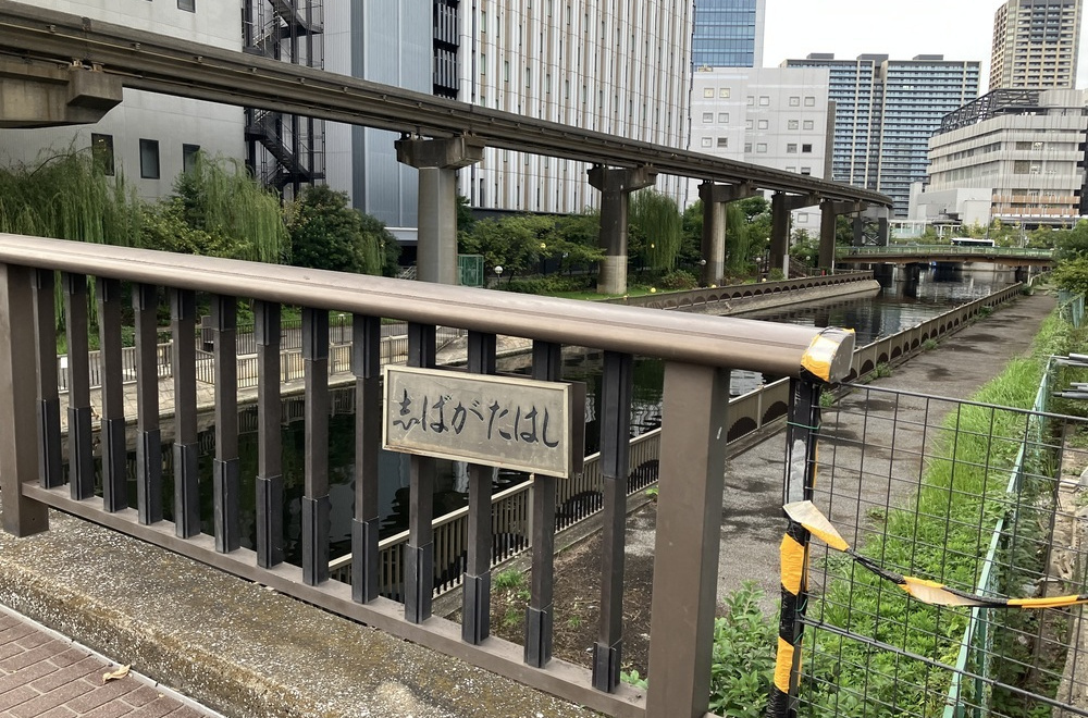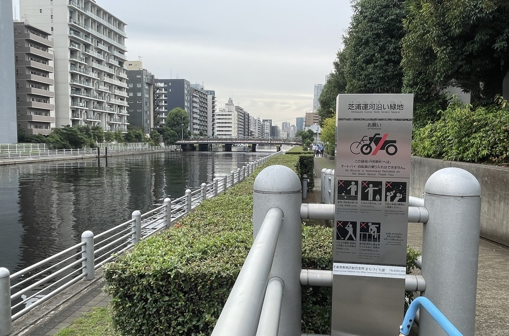 左手に「日の出ふ頭倉庫群」を柵越しに見て、ゆりかもめ「日の出駅」先の横断歩道を渡ります。高速道路の下をくぐると「琉球食堂」が見えるので、その先の「末広橋」を渡ると「芝浦運河沿緑地」です。