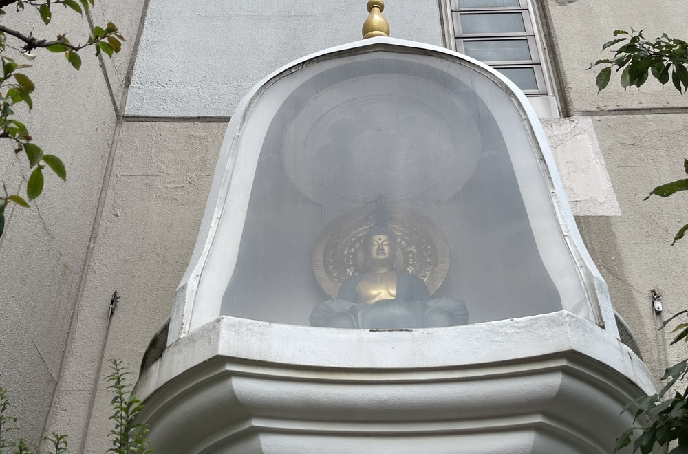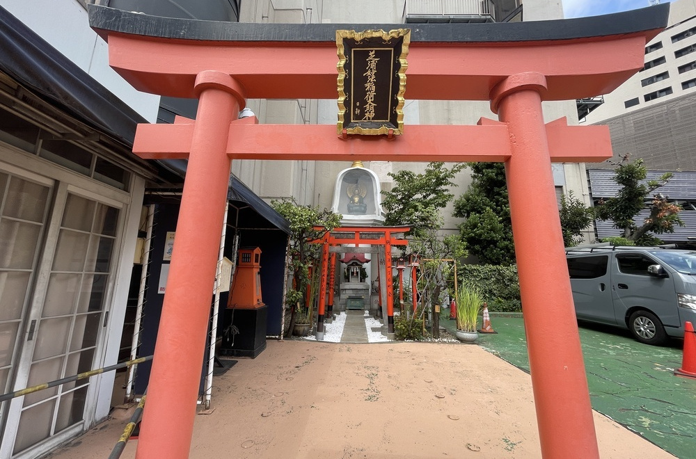 その隣にあるのが「芝浦妙法稲荷神社」です。元は小さな祠でしたが、1970年代初期に神社として創建され、1980年代初期になると赤い鳥居の奥に金色の仏像が祀られるようになり、神道と仏教が融合した珍しい形態となりました。地域の人々からは「稲荷さん」と呼ばれ親しまれ、都会の風景の中で独特な雰囲気を放っています。