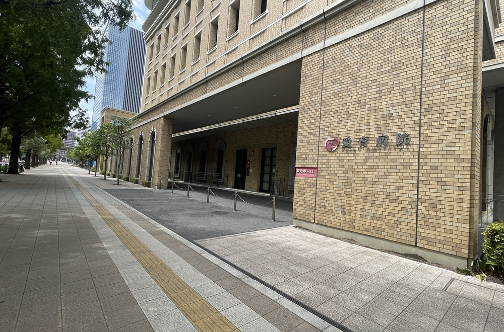 芝浦運河通り沿いに建つ「愛育病院」は、皇室の方々の出産にも利用されてきた。