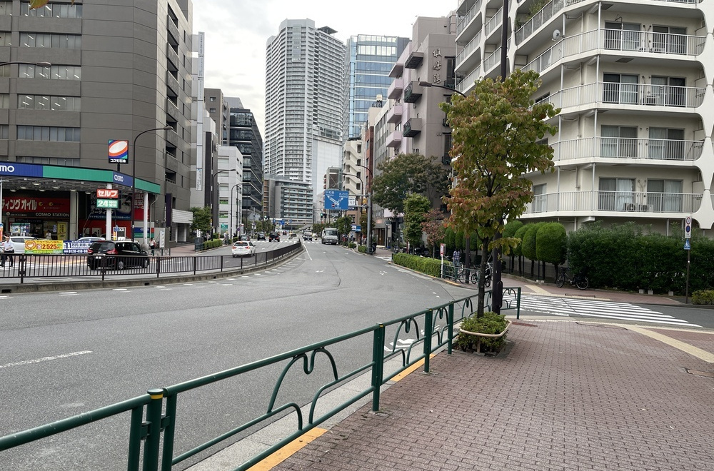 旧海岸通りにでたら左折、芝浦一丁目交差点を渡り、左にHonda、ヤナセを過ぎると、交差点を、斜め右方向の東京ポートボウルのビルがある道へ進みます。