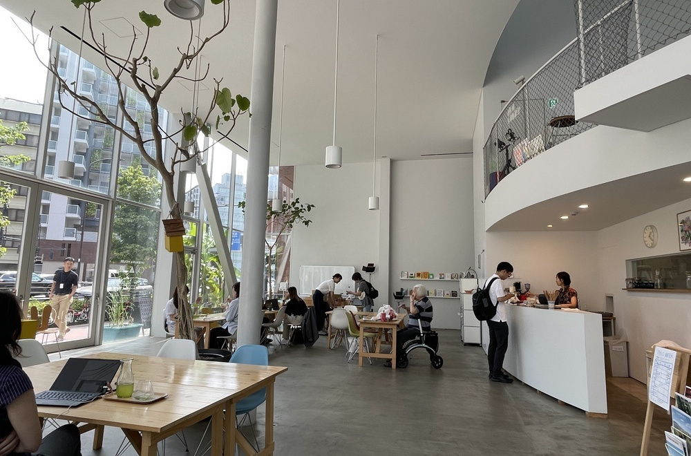 地域のコミュニティスペースとなっている「SHIBAURA HOUSE」。全面ガラス張りの個性的な建物は、世界的建築家・妹島和世氏の設計によるものです。1階のリビングと2階のラウンジは通常はフリースペースとなっており、誰でも無料で利用することが可能。1階にはドリンクやスイーツ、軽食を販売する「Tulip Cafe」が併設されており、買ったものを館内で楽しむことができます。明るく広々とした館内はゆっくり落ち着ける空間で、読書をしたり、仕事をしたり、多くの人が思い思いに過ごしています。また。1、2、5階はレンタルしており、トークイベントやワークショップなどに活用されています。