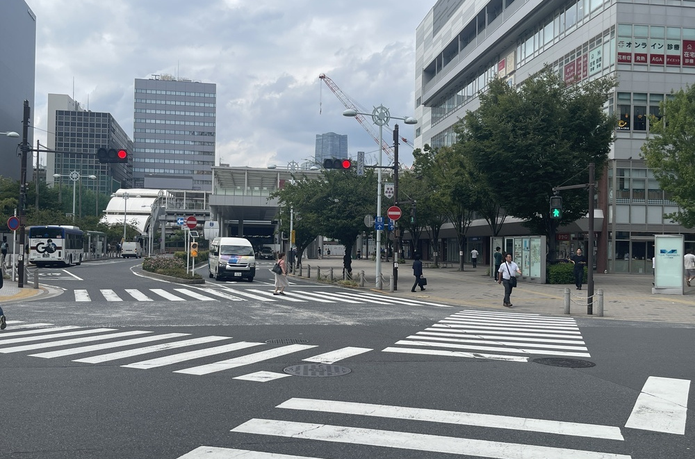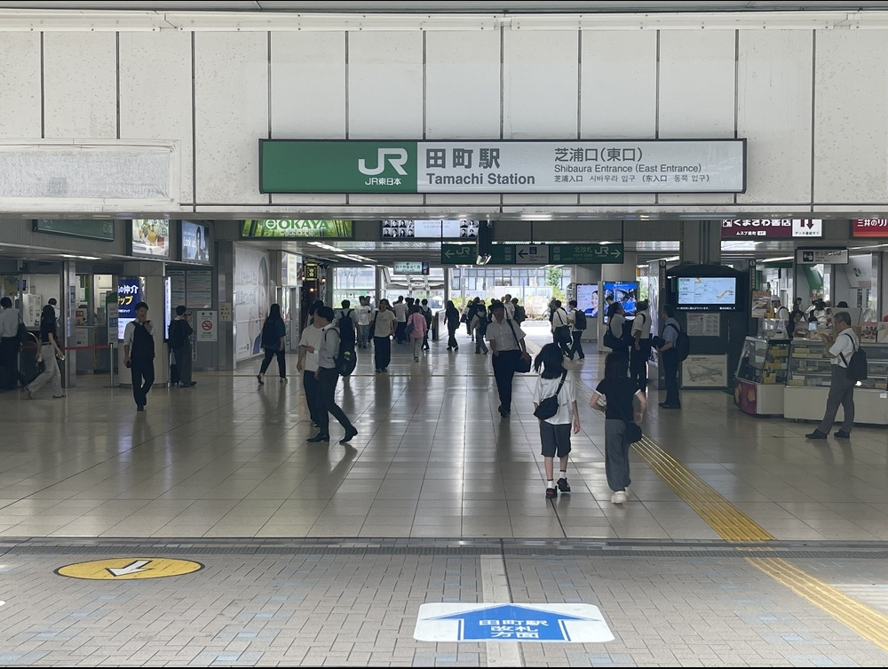 田町駅芝浦口(東口)。都営線三田駅は、反対側の田町駅三田口(西口)から徒歩4分ほど。