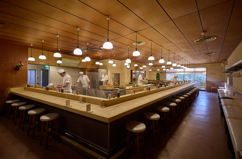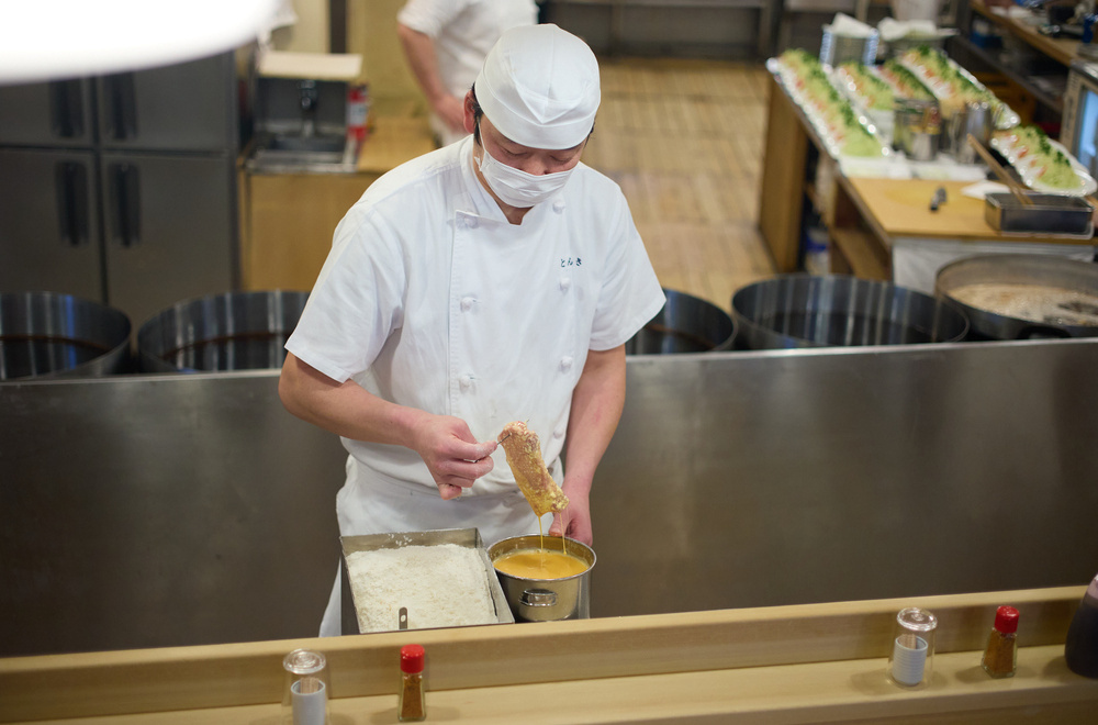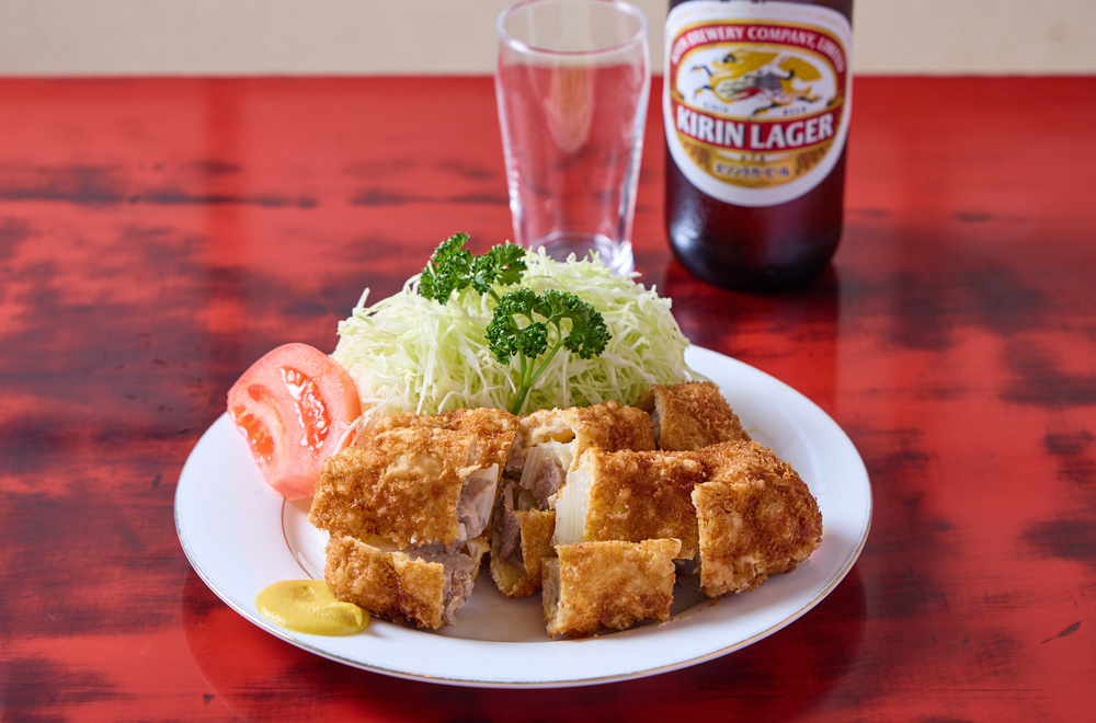 1939(昭和14)年に目黒で開業し、1967(昭和42)年に現在の店舗に。開店と同時にカウンタ―席が次々と埋まり、広い厨房で立ち働く人たちが動きだす。その活気ある光景にも魅了され、何世代にわたって訪れる人が多いお店です。メニューは「ロースかつ」「ヒレかつ」「串かつ」の3本立て。豚肉に粉と卵、粉と卵…と3回つけてから細かなパン粉をまとわせ、ラードでゆっくり揚げることで、厚めの肉が最適の火入れに。衣も存在感がある「とんき」だけの味を提供します。ビールとの組み合わせも人気で、単品のほか、定食を頼んで、まずはお酒ととんかつを1切れ、2切れ、あとはごはんと一緒に。〆は豚汁という楽しみ方もおすすめ。2階にテーブル席と朱塗りの座卓が風情たっぷりの座敷があります。
