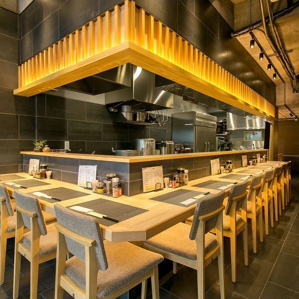 店舗外観と統一された黒が基調のスタイリッシュな店内。白木のカウンタ―席のほかにテーブル席もある。