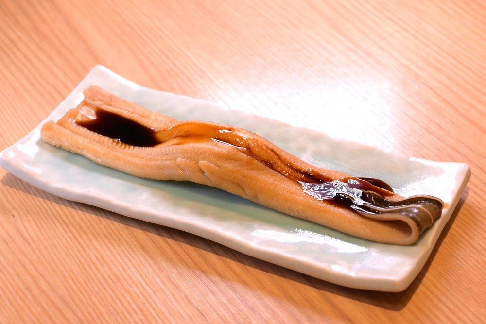ダイナミックな一皿は「穴子一本付け」715円。江戸前寿司といえば穴子。甘いタレでほくほくの身を味わおう。