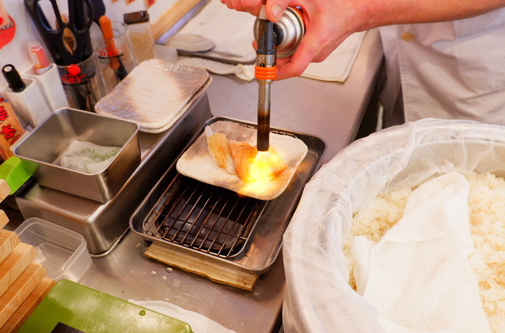 炙りはバーナーを使って丁寧に焼いていく。香りが立つので生魚が苦手な人以外にもファンは多い。