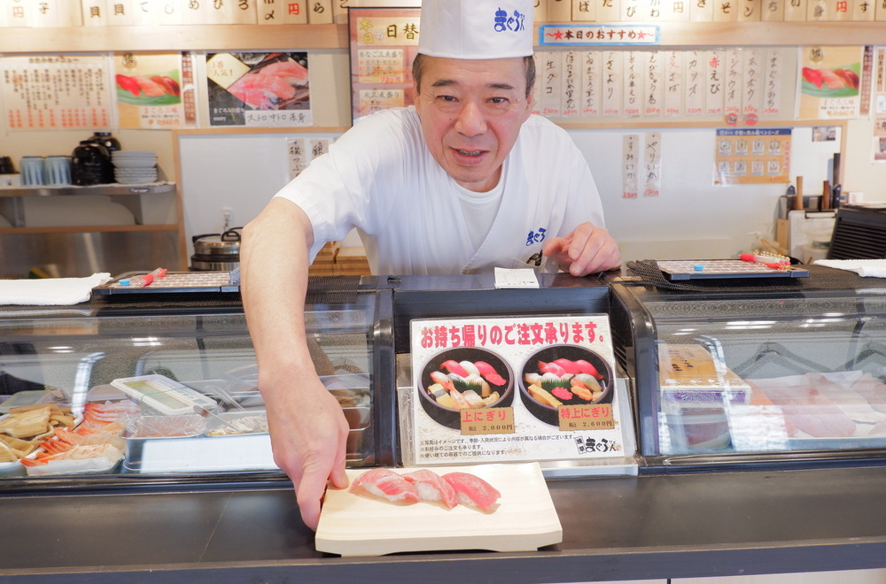 JR北千住駅の西口から出て旧日光街道沿いにある寿司店。店内には英語のわかりやすいメニューもあるので安心。