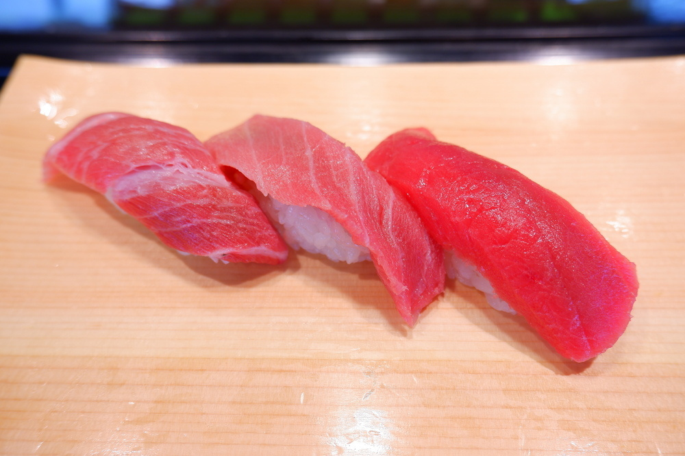 1番人気は「まぐろ3点盛り」890円。左から大トロ、中トロ、赤身。豊洲の有名な仲卸から仕入れた鮮度抜群の本マグロをぜひ味わいたい。
