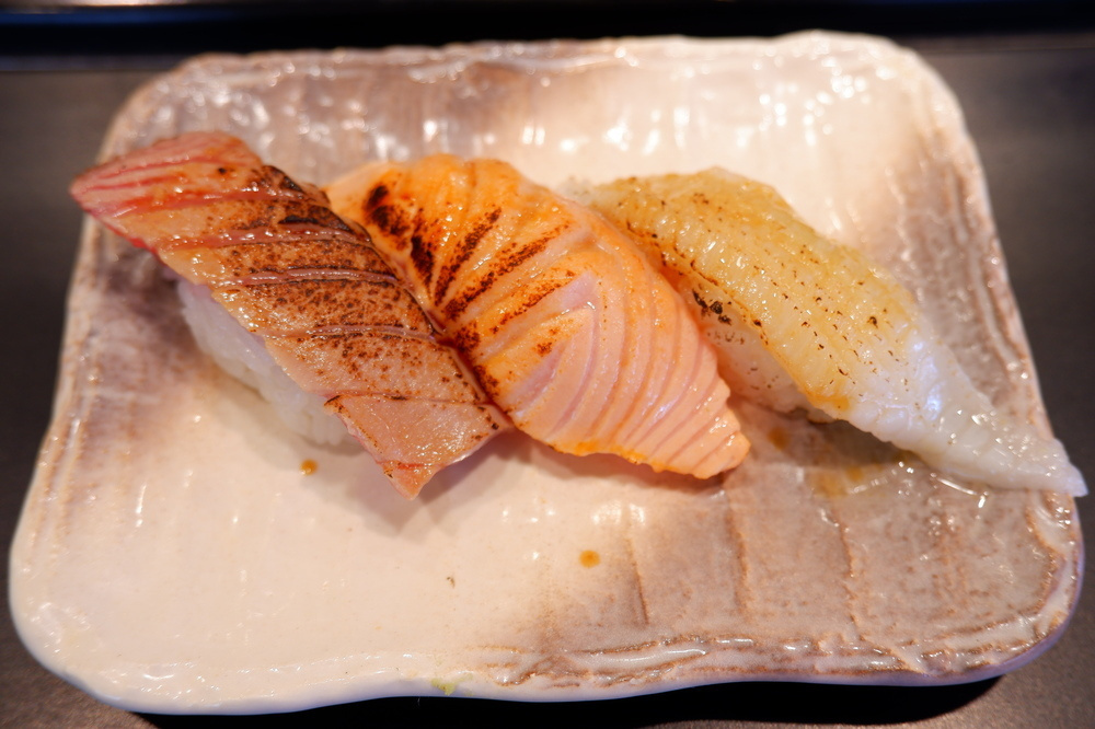 「炙り3点盛り」720円。左から中トロ、サーモン、エンガワ。程よい火加減で炙ったネタは、生で食べるのとはまた違った旨味が感じられるはず。