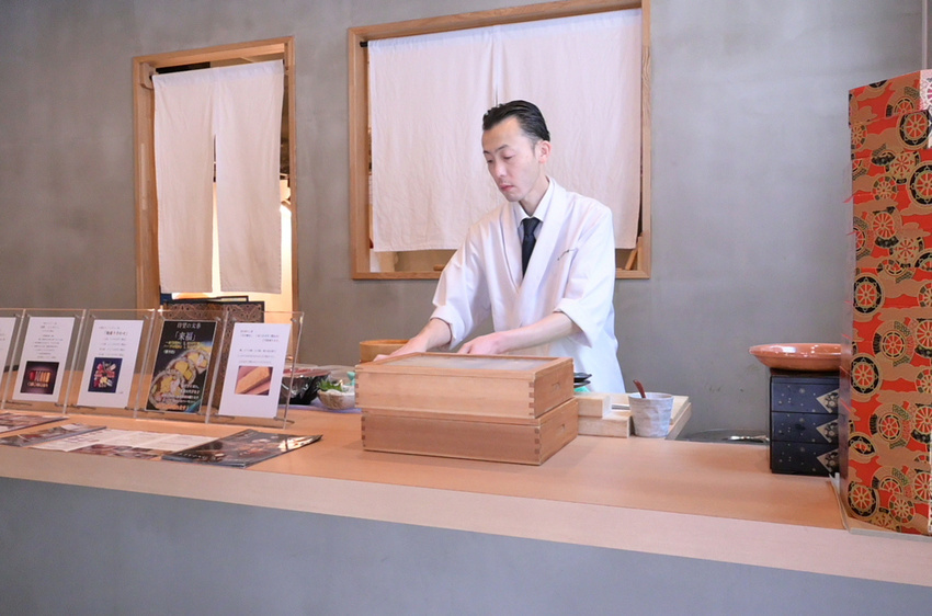 テイクアウト専門店なので店内で飲食できないが、カウンターで寿司を仕込む職人の所作は凛として気品があり、高級店のような雰囲気。