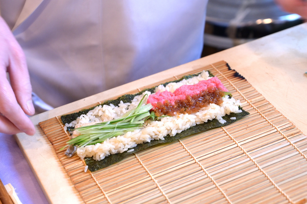 巻き物の仕込みの様子。シャリには江戸前寿司伝統の「赤シャリ」。酒粕を醸造させた赤酢を使っており、香りが強く、味はまろやか。テイクアウトで持ち帰ることを考慮し、シャリが乾かぬような工夫も凝らしている。