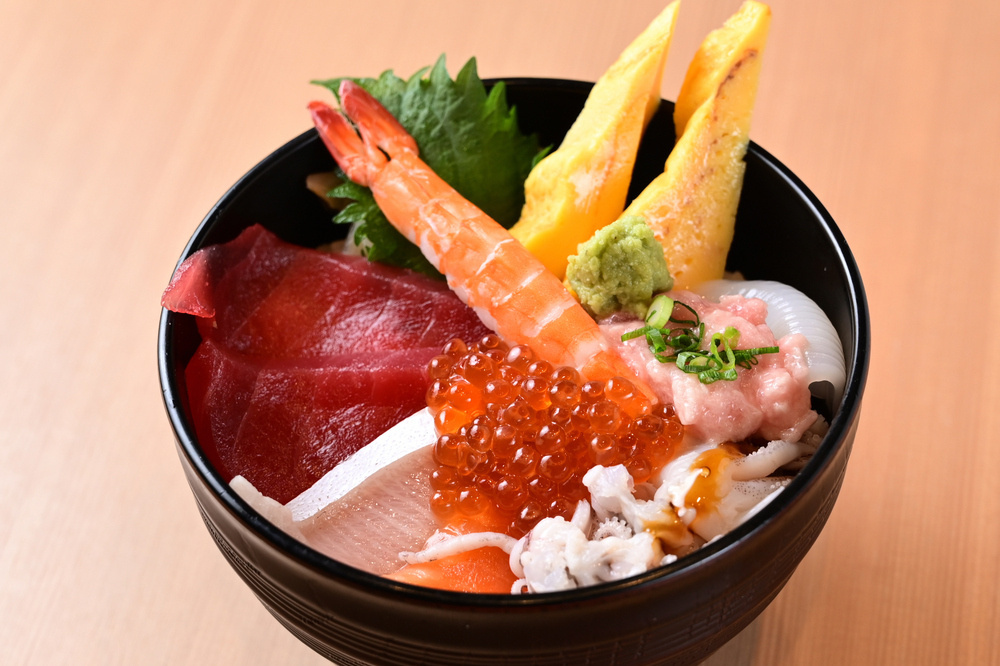「昼の海鮮ちらし(お味噌汁付)」990円。マグロやいくらをはじめとした海鮮丼。ランチタイムには、他にも、お得に食べられるセットメニューがいろいろ。