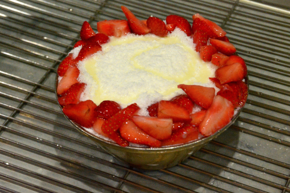 制作中のイチゴビンス。器にミルク氷をたっぷり入れ、フレッシュイチゴとピューレ、さらにミルク氷を盛ったところ。できあがりの見た目以上にボリュームたっぷり。