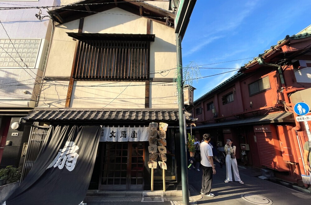 雷門柳小路入口角の趣ある店舗が荒井文扇堂雷門店。夏は団扇や扇の字を染め抜いた日よけ幕が風情を伝える。