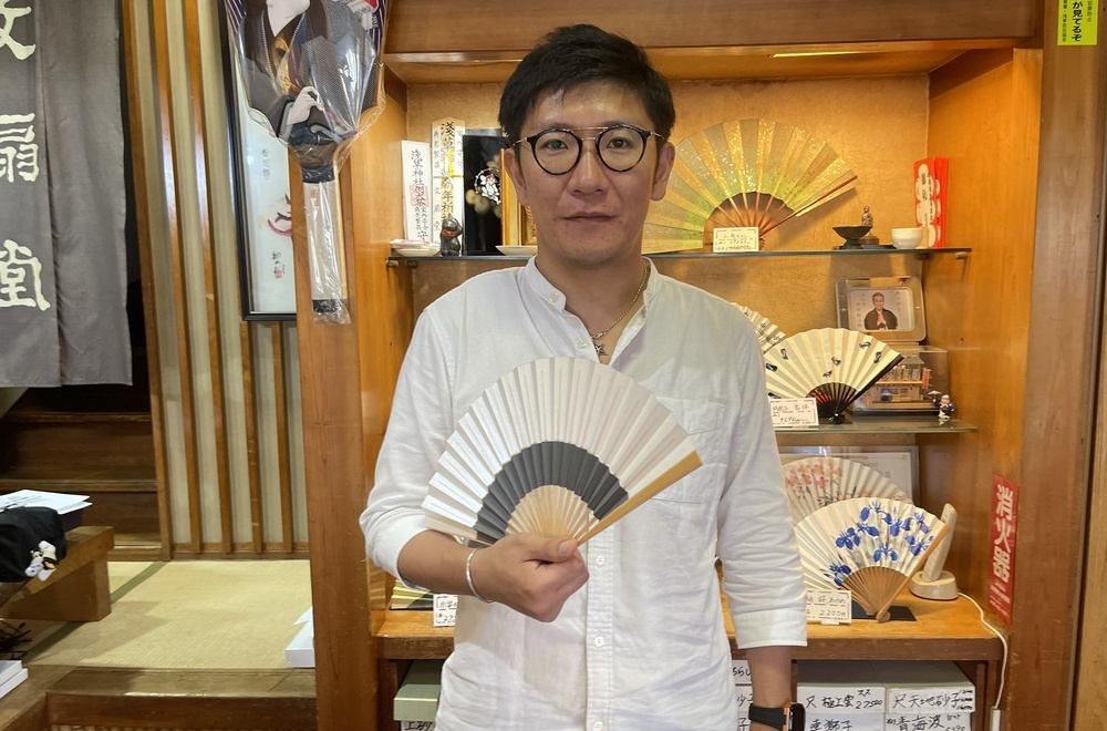 5代目店主の荒井良太さん。「年の初めには干支をデザインした手描きの扇子が店頭に並びます」。