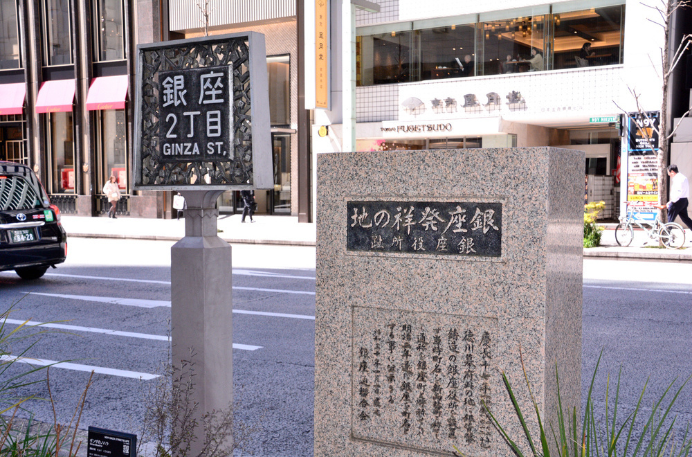 高級ブランドショップが並ぶ銀座通りには「銀座発祥の地」の記念碑も