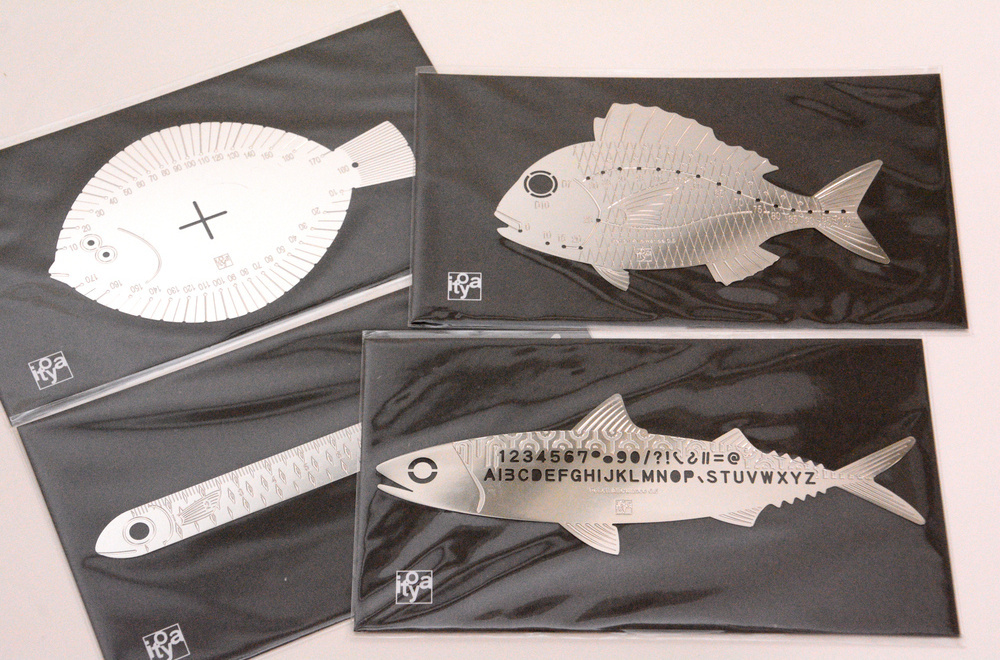伊東屋オリジナル「おいしい魚シリーズ」から、魚をモチーフにしたステンレス製メジャー。ヒラメ分度器1980円、サバテンプレート1870円、イワシ定規1430円、タイコンパス1980円。