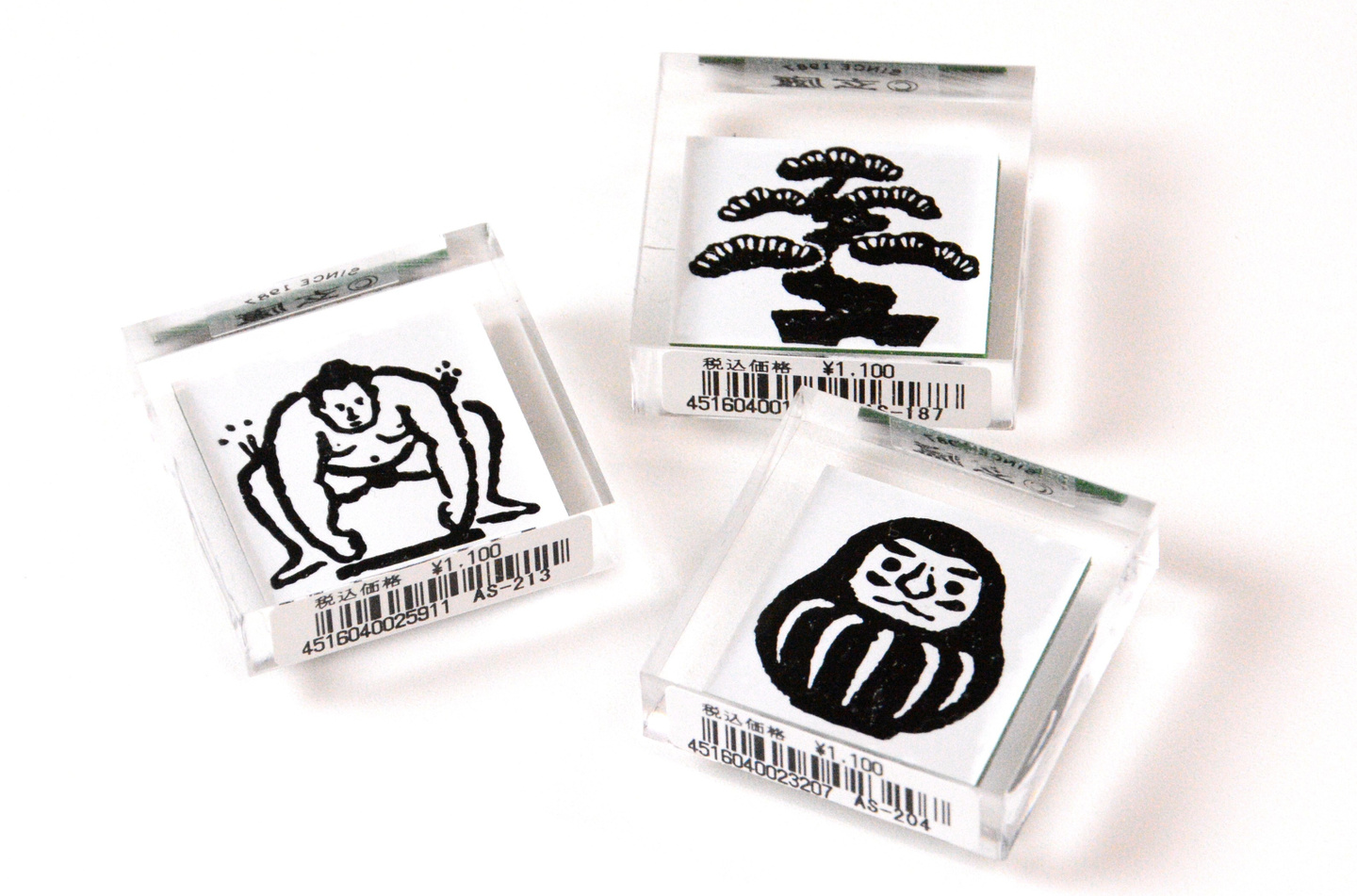 力士、だるま、盆栽松など、ひと押しで便箋や封筒、カードに日本を感じさせてくれる図柄のアクリルスタンプ各1100円。東京生まれの文具メーカー「玄廬(げんろ)」製。