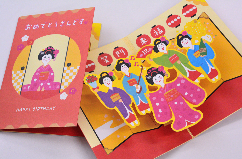 誕生日のお祝いメッセージとバースデーソングが流れる立体オルゴールカード(Hallmark)。着物姿の女性が京言葉で話すユニークで可愛らしいバースデーカード1210円。