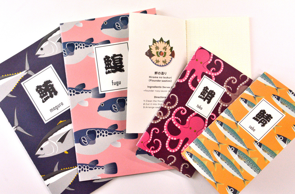 魚の図案と筆文字がユーモラスなデザインノート。ノートを開くと見返し部には表紙の魚のレシピが英語で書かれている。A5スリム各495円、A6スリム各330円(各全8種)。