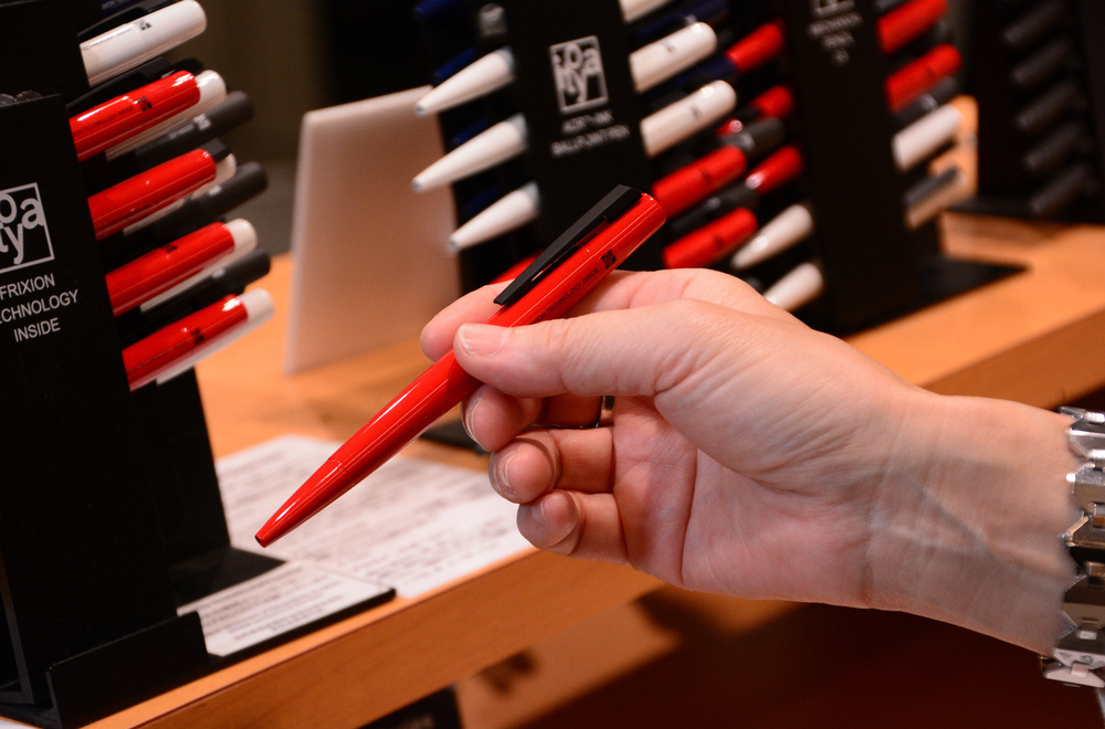 12階建ての本館はフロアごとにテーマを設けて商品展開しています。お店で扱うのは日本製だけではありません。最高級の万年筆や由緒あるメーカーの画材具、書道用品など、海外の優れた逸品も並びます。さらに人気が高いのは伊東屋オリジナル商品の数々。たとえば、グラフィックや配色に遊び心を盛り込んだ「おいしい魚シリーズ」はノート、トランプ、ピンバッジなどアイテムも豊富。海外の方へのプレゼントとしてもおすすめです。「ITOYA 110イレーサブルボールペン」は、消えるボールペン「フリクション」の機能性はそのままに、道具として永く使えるデザインにこだわった1本。実際手にしてみると適度な重量感と重心バランスが絶妙で、愛用者が多いのも納得です。オリジナル商品の「ここでしか手に入らない」という付加価値は、おみやげとして選びたくなるポイント。さらに、使ってワクワクするようなユニークさにも着目しながら、各フロアを回遊してみてはいかがでしょうか。