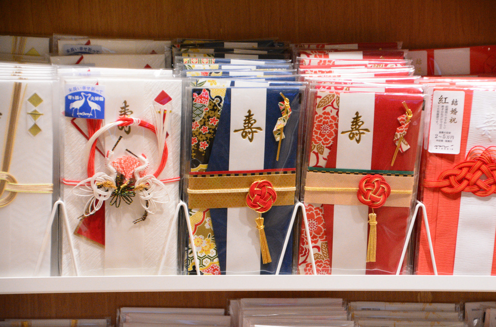 美しい水引を施したご祝儀袋に興味を持つ外国人も多い。用途はスタッフが説明してくれる。