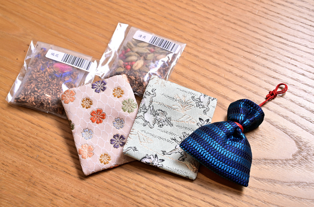 白檀などに丁子 (クローブ)、桂皮(シナモン)などなじみの深いハーブを配合した香りが揃う。各880円。巾着は西陣織などの生地から選べる(別売り550円~)。