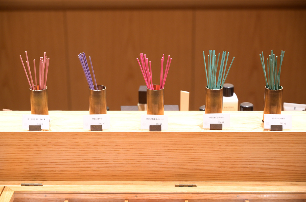 お客様を迎えるお店の香りや、アイテムの見本で確かめられる香りは、周囲を巻き込むのではなく、どこか風が通るような自然な香り方です。「和の香りは、強く漂ってくるのではなくこちらから探しに行くような世界観。主張はせずになじむのが特徴です。さまざまなアイテムでその世界を感じていただけます」(馬越さん)。