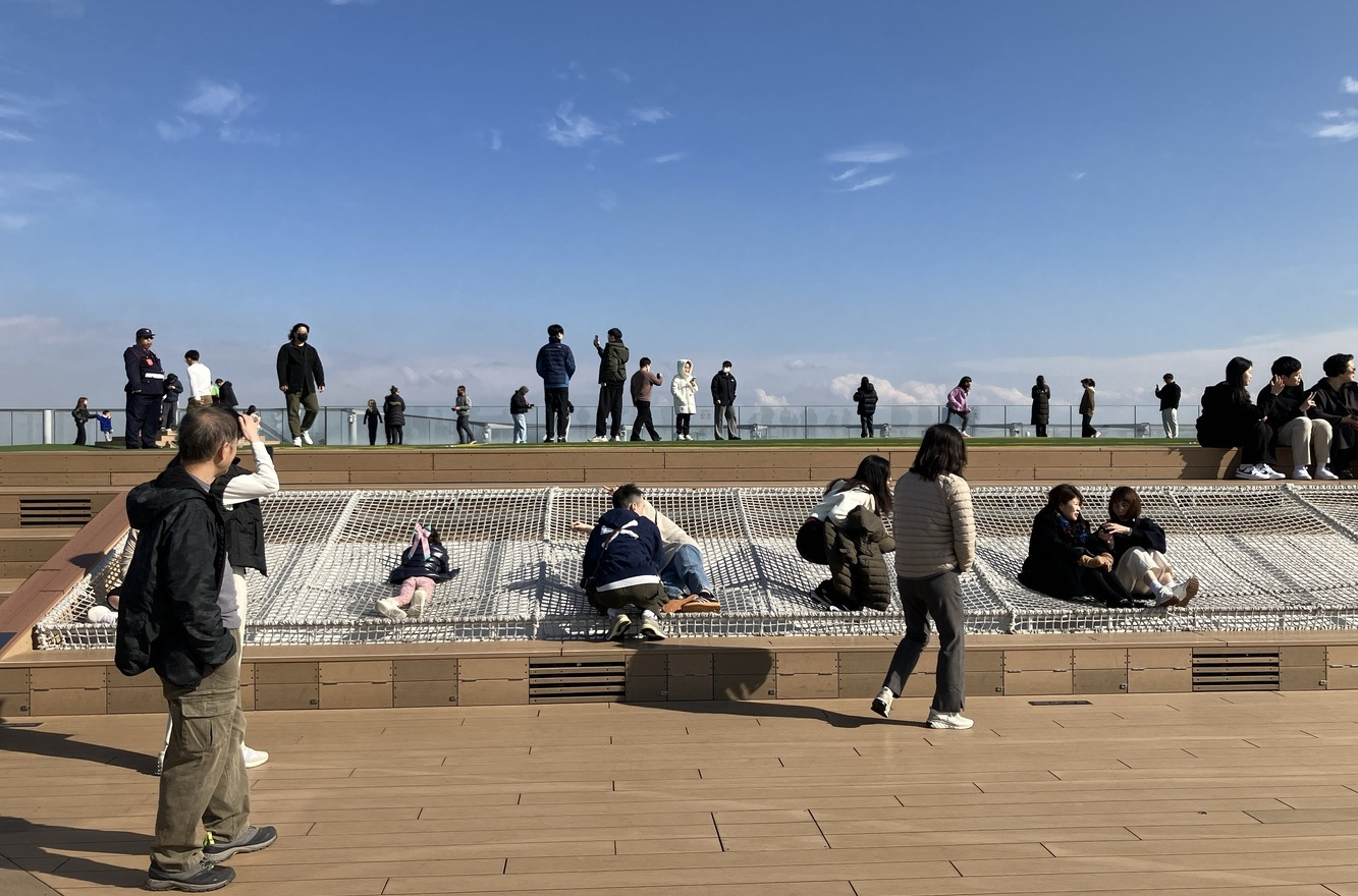 屋外へ出たら、さらにエレベーターで屋上へ。目の前には、まさに息を飲むほどの絶景が広がります。オープンエアであることはもちろん、約2500㎡の広々とした場内には視界を遮るものがなく、囲いには透明度の高いガラスが使用されているため開放感にあふれています。一瞬にして日常から解き放たれ、気持ちも晴れやかになります。滞在時間に制限はないので、心ゆくまでのんびりと過ごせます。