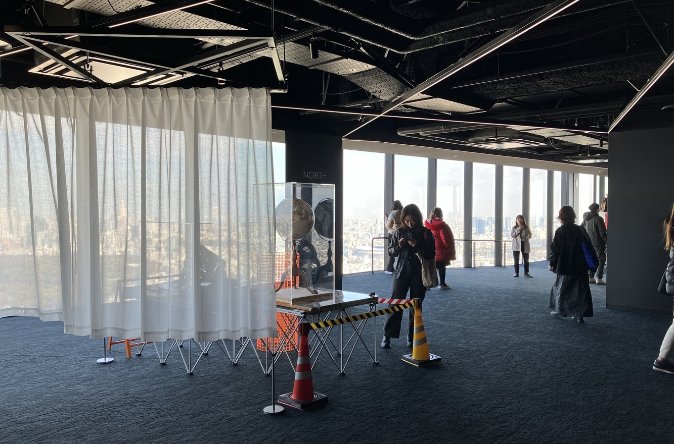 屋外で展望を満喫したら、46階の「SKY GALLERY」へ。ここでは、高層からの景色と共にアートを楽しむことができます。アートの企画展「SKY GALLERY EXHIBITION」がシリーズで行われていて、取材時には、美術家・中﨑透によるエキシビション「Ding-dong, Ding-dong 〜Bells ringing at the bottom of the valley〜」が開催中でした。SHIBUYA SKYでは、「SKY STAGE」の眺望とともに、感性を刺激するこれらアートの数々も見逃せません。