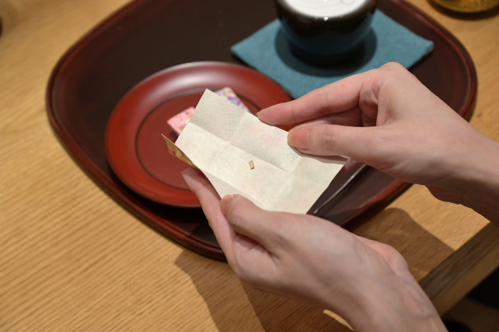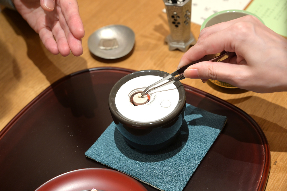 紙包みを開いて香木を取り出します。まずは和木のくすのきから。香木はミリサイズの木片なので扱いは慎重に。火道具から香匙(こうさじ)を使い、香木を香炉に乗せます。