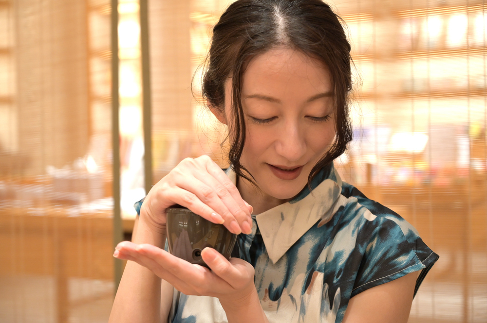 電子香炉で香木を温め、香りを聞きます。左手に香炉をのせて顔を近づけ、右手をドーム型にしてかぶせます。親指と人差し指の間から香りを吸ったら顔を少し離して横を向き、息を吐きます。本来は灰が入った香炉を使うので、灰が飛び散らないための作法です。