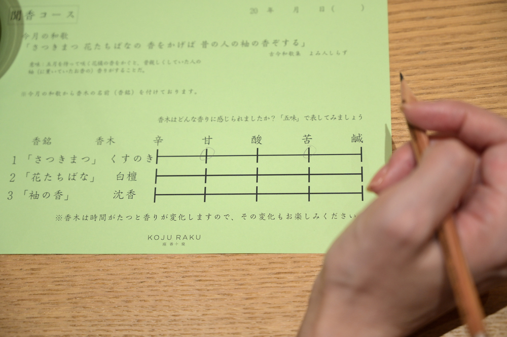 香りを表現する共通言語が「五味」。「甘、苦、辛、酸、鹹(しおからい)」の5つの味覚にたとえて記憶します。香木をひとつ聞香するごとに用意されたシートに記入していきます。