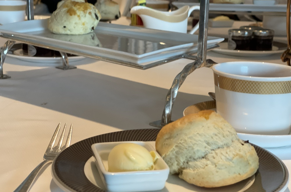 メニューは、スコーンとクロテッドクリーム、小さめのフィンガー・サンドイッチやセイボリー、ケーキ類などです。飲み物はもちろん紅茶で、ポットのミルクをお好みで注いで楽しみます。クイーン・エリザベスのアフタヌーン・ティーは、毎日午後3時半から始まり、ピアノやハーブ、バイオリンなどの生演奏も提供されるそう。ドレスコードはなく、乗客は無料で利用できるそうです。