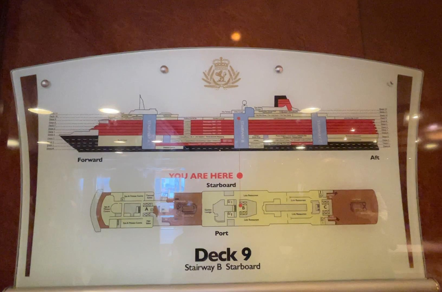 アフタヌーン・ティー体験の後は、ガイドに案内され、船内の主な施設を一巡しました。 船内見取り図を見ると、最下階から最上階まで、12のデッキがあることがわかります。このうちデッキ5~8が客室、その他のデッキに、食事、エンターテイメント、サービスなどに関するさまざまな施設が設置されているのです。