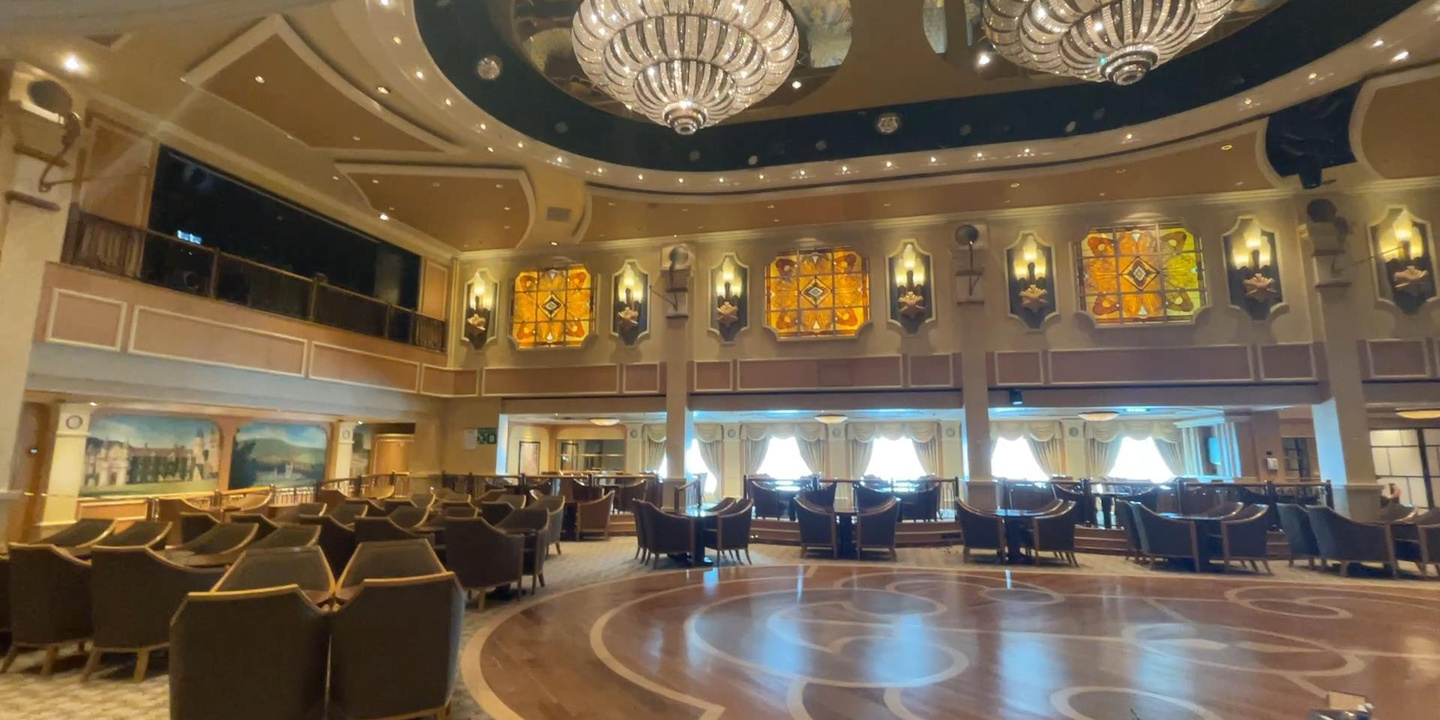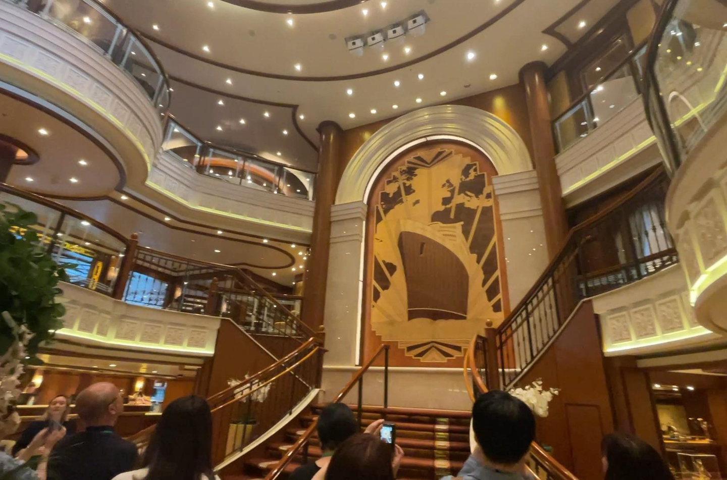 グランド・ロビー。三層吹き抜けの壮大な空間。クイーン・エリザベスの壁画が出迎える。