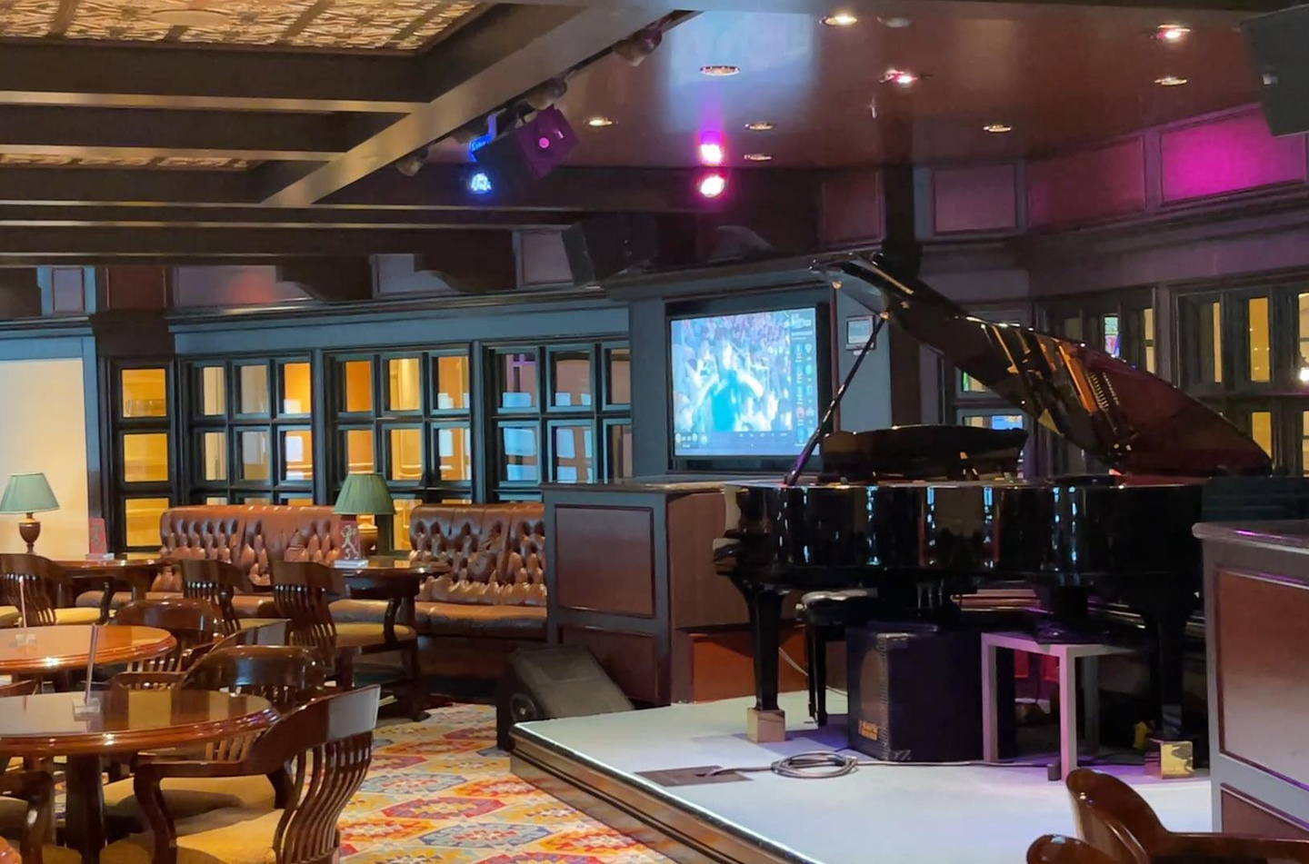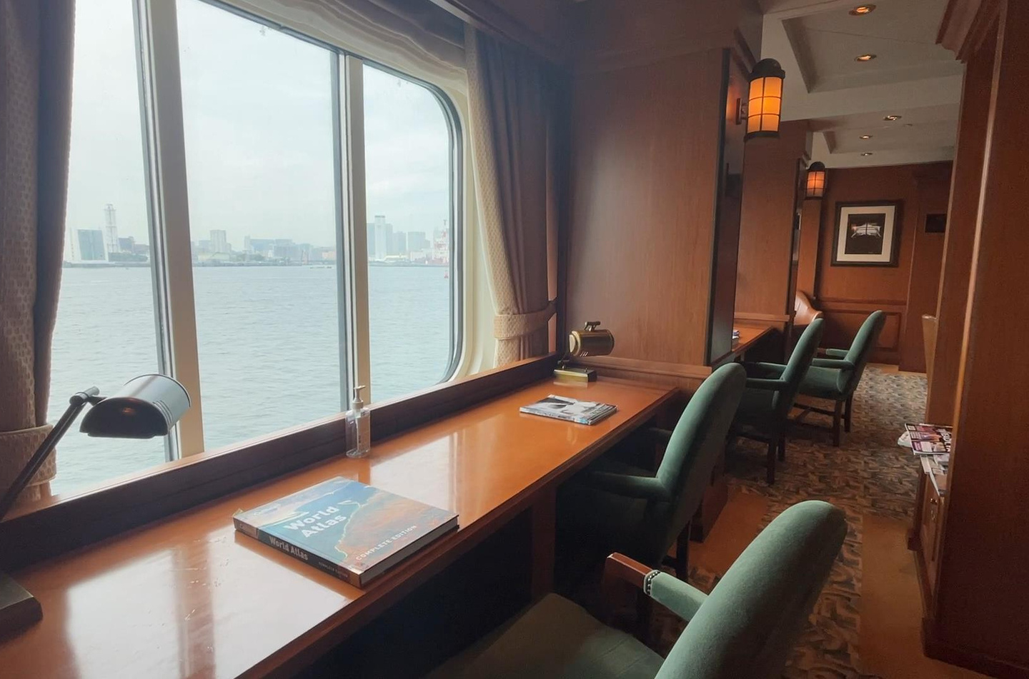 船内施設は、各デッキのあちこちに設けられているため、見学するために、階段やエレベーターで上ったり下りたり、長いデッキを行ったり来たりして、広い船内を縦横に歩き回りました。船内は英国風インテリアで統一され、英国のお城の中のような雰囲気。見学しているだけで、優雅な気分になりました。印象に残った船内施設をピックアップしてみましょう。