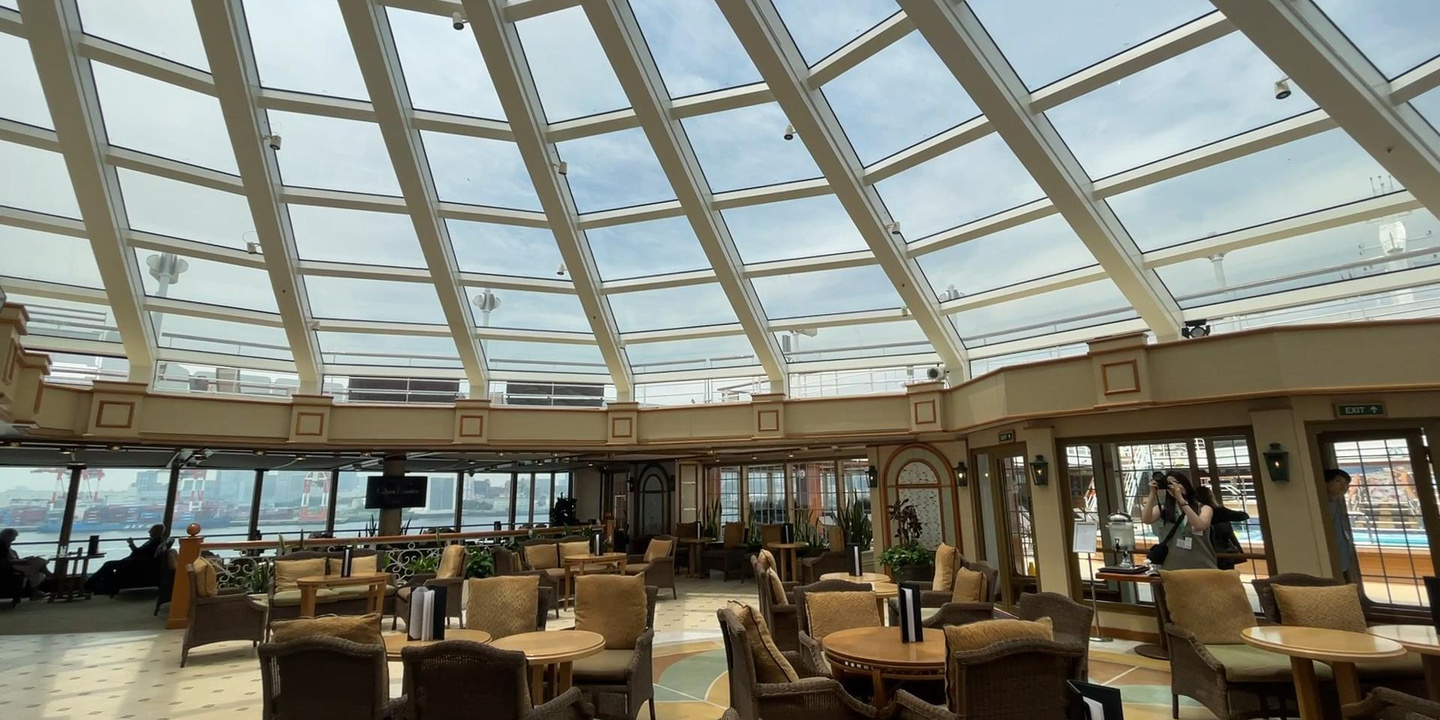 ガーデン・ラウンジ。ガラス天井から昼は光が降り注ぎ、夜は星空を眺められる、なんとも贅沢な空間。
