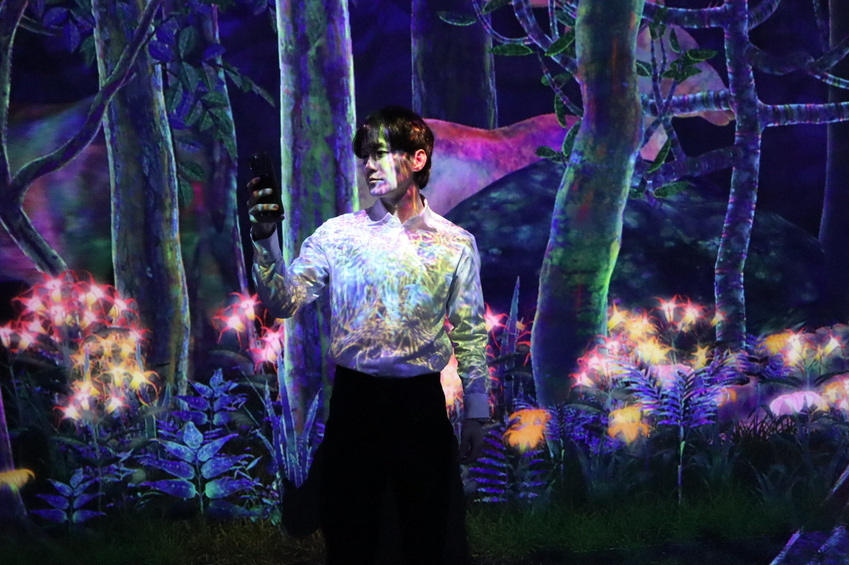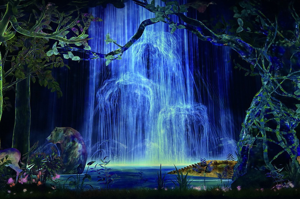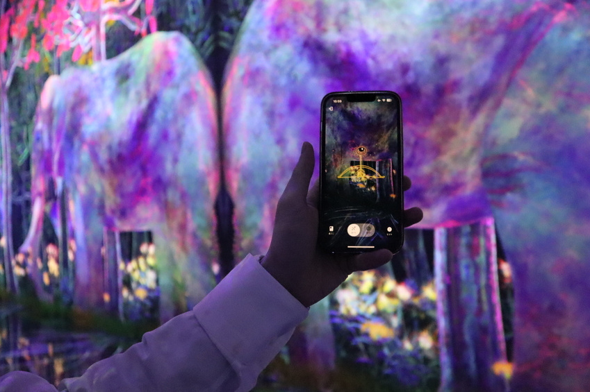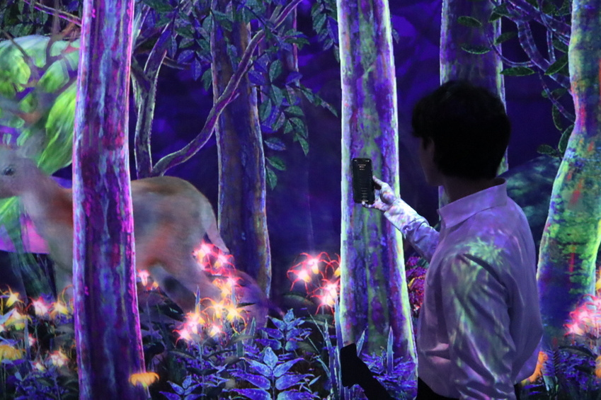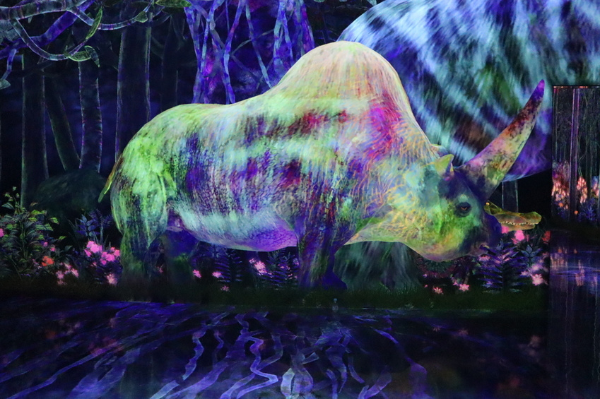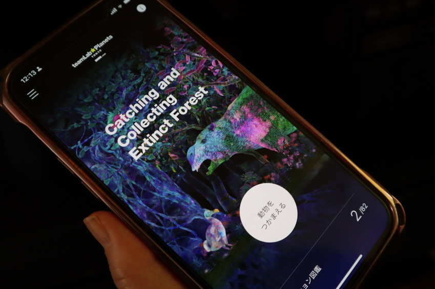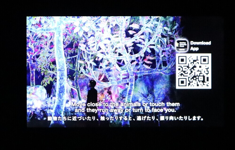 新エリアは、大自然を模したアートが特徴的です。その象徴とも言えるのが「つかまえて集める森」。この森には、絶滅した動物が住んでいて、壁面の動物に近づいたり、触れたりすると、逃げたり、振り向いたりします。