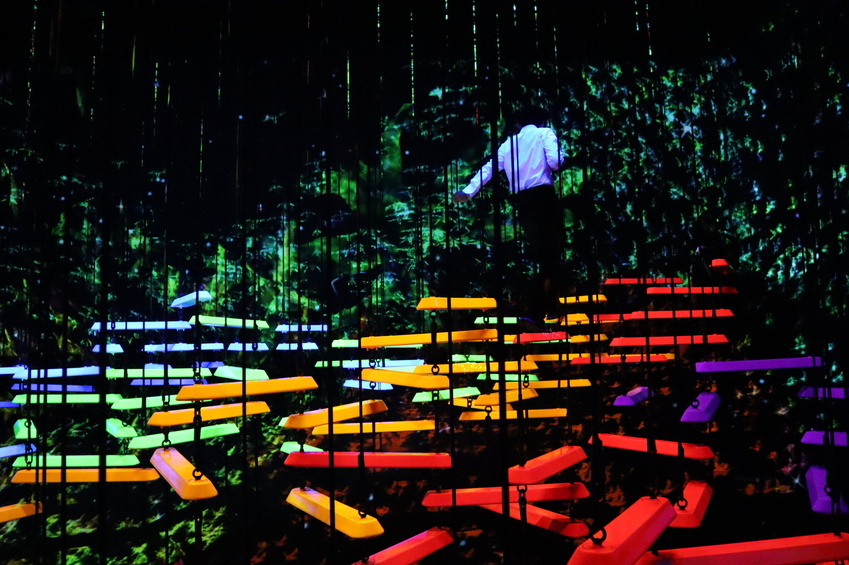 カラフルな棒の上をバランスをとりながら落ちないように渡っていくので、森林に張り巡らされた木の根っこや枝を渡って歩く感覚を思いだします。