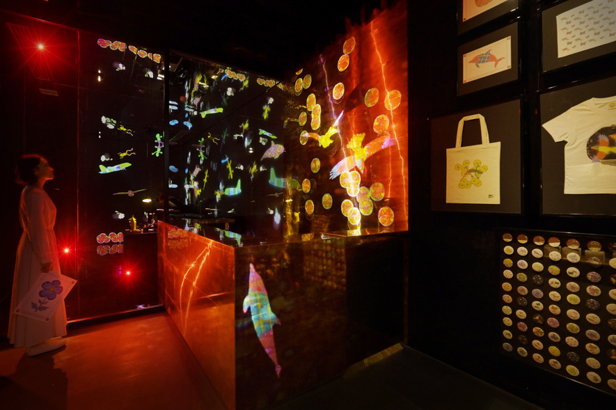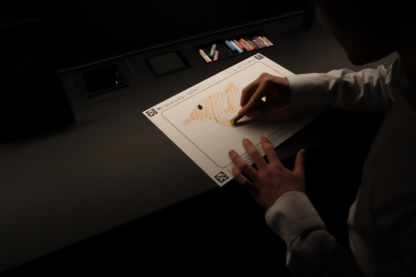 「学ぶ!未来の遊園地」は、共同的な創造性、共創(きょうそう)をコンセプトにした教育的なプロジェクトで、他者と共に自由に世界を創造することを楽しむ「遊園地」をテーマにしています。 「スケッチ環世界」では、紙に書いた飛行機、イルカ、タカ、蝶の絵が、目の前に立体で出現し世界に飛び立ちます。アプリを使って自分が描いた絵を操縦することもできます。僕の描いたイルカも元気に泳ぎ始めました。塗り絵タイプなので、絵に自信がなくても問題なく楽しめます。