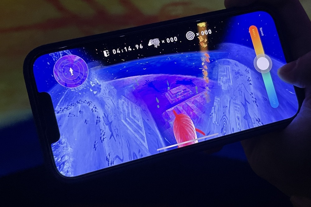 専用アプリの画面は、その生物の視野をイメージしているとのこと。今回はイルカの絵を動かしているので、イルカの視野と同じように前方と斜め後方が画面に写っています。イルカを下に動かしたい時はスマホを前に倒し、上に動かしたいときはスマートホンを上に向けます。