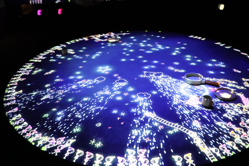 「こびとが住まうテーブル」「こびとが住まう奏でる壁」「こびとが住まう宇宙の壁」は、鑑賞者が触れたり描いたりする線が、テーブルや壁に住んでいるこびとの動きに影響をあたえる空間です。テーブルにお皿のおもちゃを置くとりんごの絵が現れたり、フライパンのおもちゃで目玉焼きを焼いたりすることもできます。かわいいこびとのキャラクターも気に入りました。